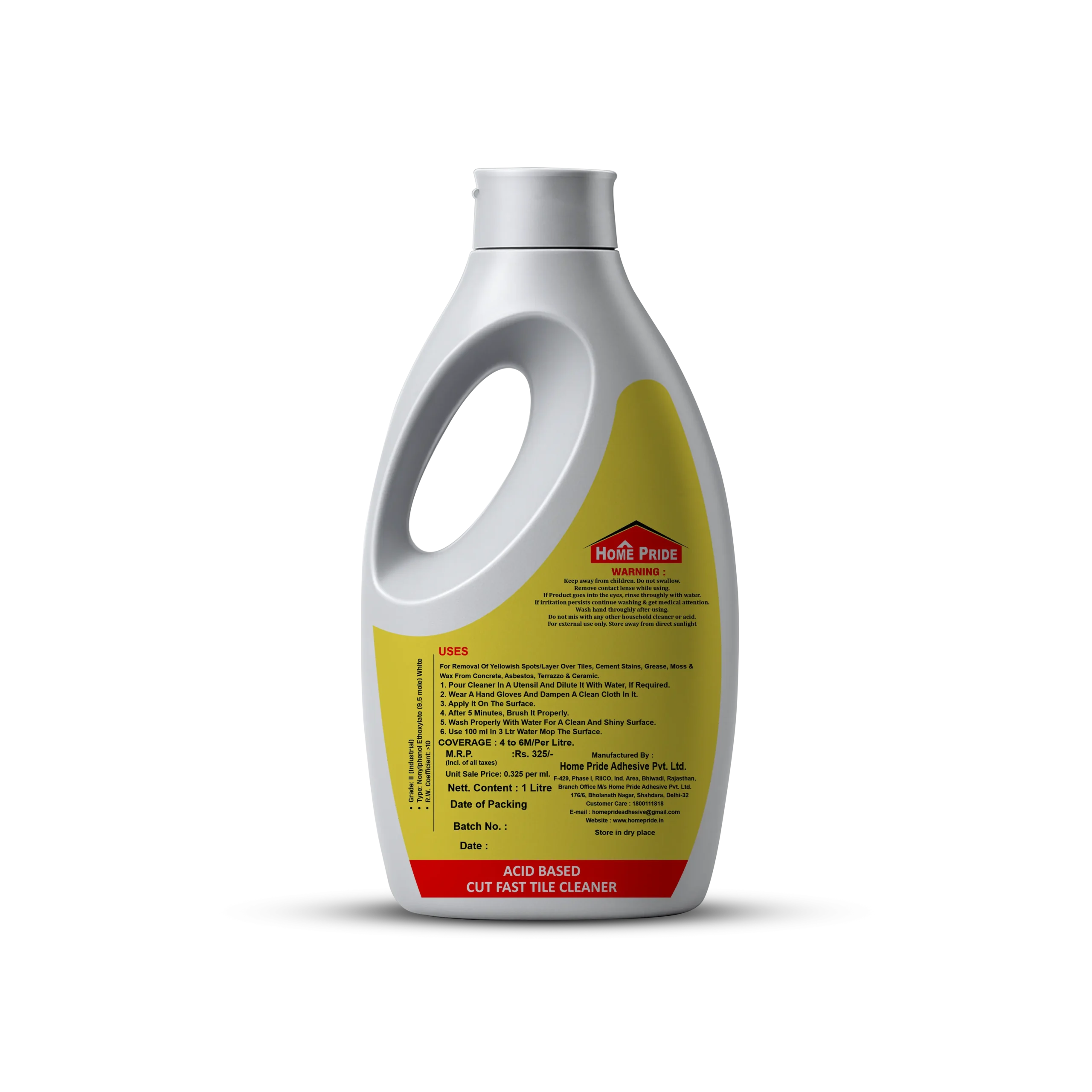 Home Pride Cutfast Tile Cleaner is a powerful heavy duty cleaner specifically designed for ceramic wall and floor tiles. It effectively removes tough stains and other types of stains. This product is non-corrosive, fast-acting, easy to use, and economical, making it ideal for daily maintenance in interior and exterior areas.
